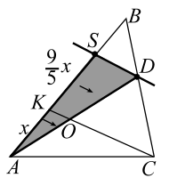 В треугольнике $$ ASD$$ по построению $$ SD\left|\right|KO$$, По утверждению $$ 2°$$ имеем $$ AO:OD=AK:KS$$, откуда следует $$ AO:OD=5:9$$